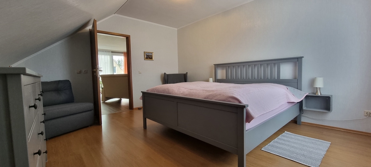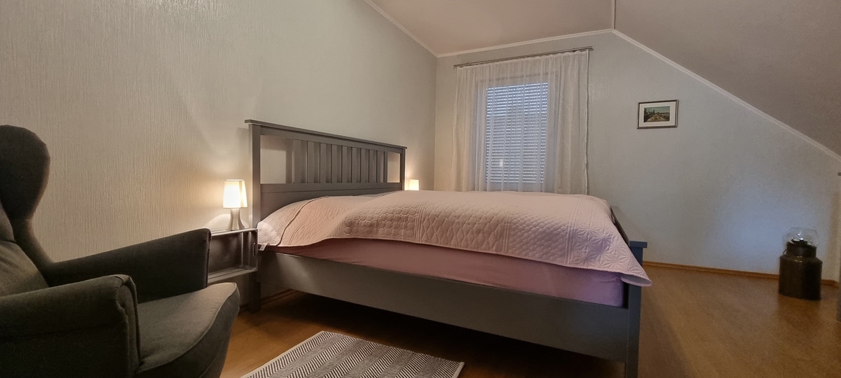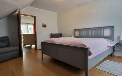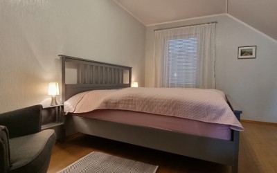 Das große Doppelbett im Schlafzimmer sorgt für den nötigen Schlaf. Ein Sessel, der zur dritten Schlafmöglichkeit ausgezogen werden kann, steht ebenfalls bereit.